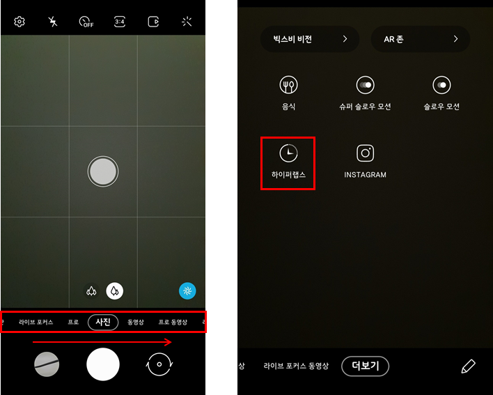 혹시 본인이 최신 스마트폰을 사용하고 있음에도 불구하고 하이퍼 랩스 기능을 못 찾겠다면, 갤럭시 카메를 실행하고 위의 왼쪽 그림에 표시된 셔터 버튼 상단의 트레이 영역을 좌우로 먼저 드래그해보면 있을 가능성이 있습니다. 그래도 없다면 가장 오른쪽으로 이동하여 '더 보기' 메뉴에서 하이퍼 랩스 이외에도 다양한 카메라의 기능들을 선택할 수 있고, 각 아이콘을 길게 누르거나 우측 하단의 연필 모양 아이콘을 누르면 트레이에 기능을 추가/제거하거나 순서를 바꾸는 등 편집도 할 수 있습니다. '더 보기'에도 없다면 본인이 사용하는 기종이 하이퍼 랩스를 지원하지 않는 기종이니... 별도의 써드파티 카메라 애플리케이션을 설치해보는 것을 추천드립니다.