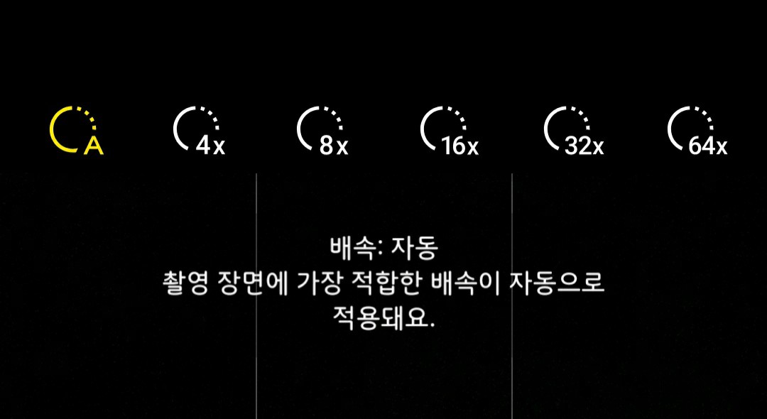 배속의 의미를 쉽게 설명하면 4배속은 4초 동안 촬영된 영상을 1초로 압축, 8배속은 8초 동안 촬영된 영상을 1초로 압축, 16배속은 16초 동안....이라는 의미입니다. 배속의 숫자가 클수록 더 많은 시간을 압축하게 됩니다. 따라서 촬영하려는 피사체의 움직임이나 변화 속도가 빠를수록 낮은 배속을, 움직임이나 변화 속도가 느릴수록 높은 배속을 선택하는 것이 요령입니다.