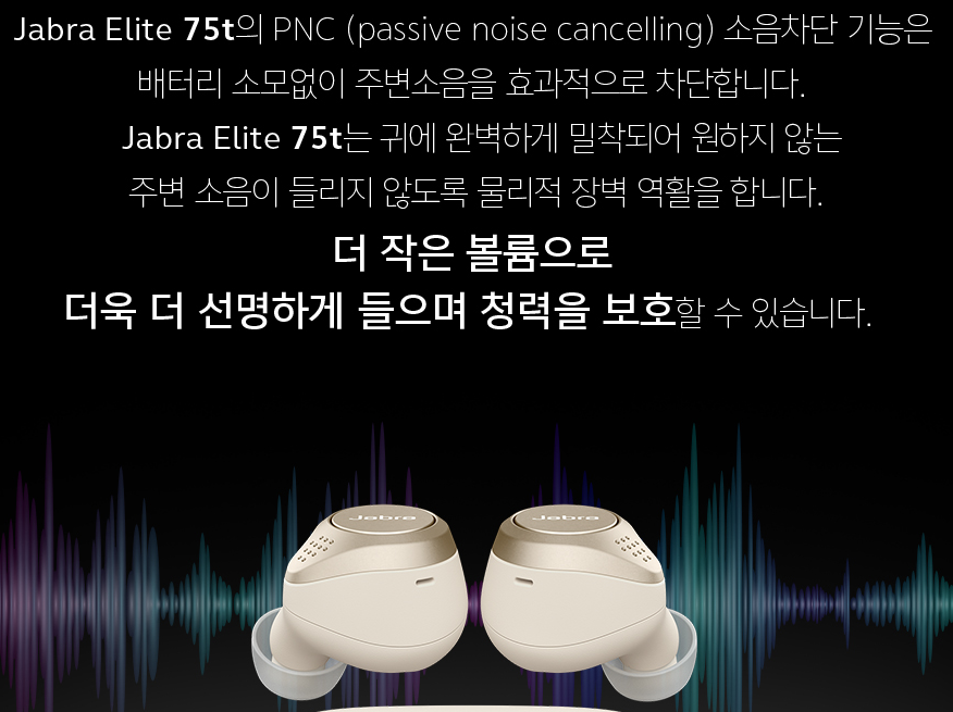 패시브 노이즈 캔슬링(Passive Noise Canceling)이란, 이어폰이 귀에 최대한 밀착되게끔 형상을 설계하여 물리적으로 외부 소음을 차단하는 기능을 말합니다. 엄연히 말하면 노이즈 캔슬링 보다는 차음(遮音), 노이즈 아이솔레이션(Noise Isolation) 등의 용어로 표현하는 것이 더욱 맞을 것 같다는 생각도 듭니다. 액티브 노이즈 캔슬링과 달리 별도의 전기적인 기능을 수행하는 것이 아니기 때문에 배터리 소모가 전혀 없다는 장점이 있으며 외부 소음을 물리적을 차단하고 있기 때문에 소음의 유형이나 규칙성과 관계없이 일정 수준의 차음 효과를 계속해서 유지할 수 있다는 장점도 있습니다. 주로 귓속에 삽입되는 형태인 커널형 이어폰에 많이 적용되는 기술이며 커널형 이어폰은 어떤 제품이든 어느 정도의 차음 효과는 있으므로 PNC가 탑재되어 있다고 할 수 있겠습니다만, ANC 대신 패시브 노이즈 캔슬링 성능을 강조하는 대표적인 제품은 필자도 사용하고 있는 자브라의 엘리트 75T가 있습니다.