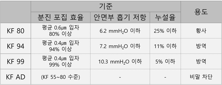 - KF 99 등급은 평균 0.4마이크로미터 크기의 입자 99% 차단