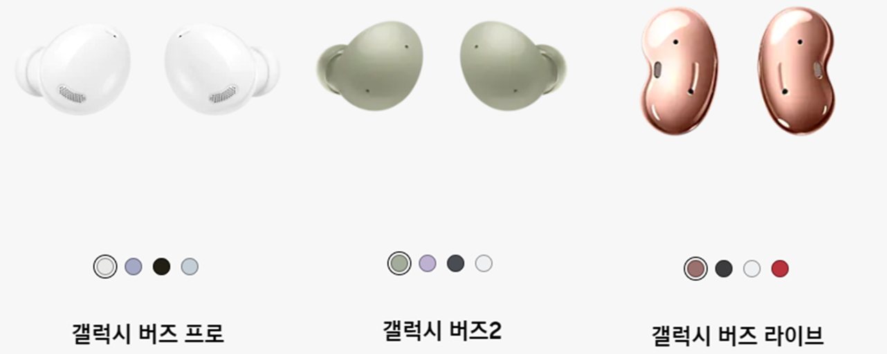 갤럭시 버즈 시리즈는 2022년 2월 현재, 총 세가지 모델이 판매중입니다.